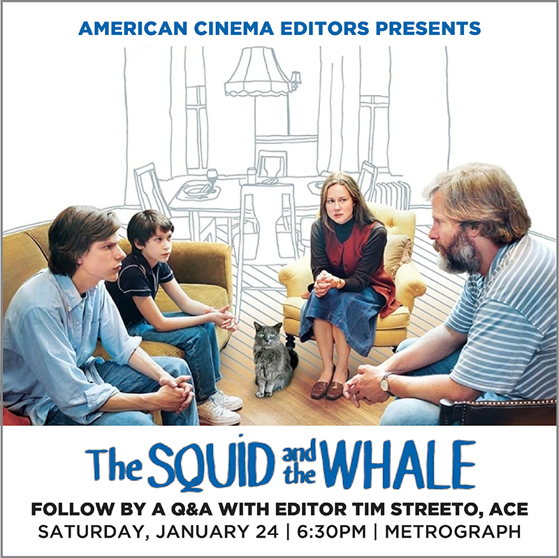 Our January "American Cinema Editors Presents at Metrograph" is The Squid and the Whale followed by a Q&A with the film’s editor, Tim Streeto, ACE, moderated by Emmy and ACE Eddie Award-winning editor Joanna Naugle, ACE.